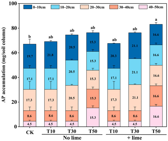 The accumulated levels of AP across 0–50 cm soil depth at the end of the incubation period. The differences of accumulation levels among the different treatments were determined by Duncan’s test. Different small letters indicate significant differences at the level of p < 0.05. CK, initial content; T10, tillage depth 10 cm; T30, tillage depth 30 cm; T50, tillage depth 50 cm; T10+Lime, T10 plus lime; T30+Lime, T30 plus lime; T50+Lime, T50 plus lime.
