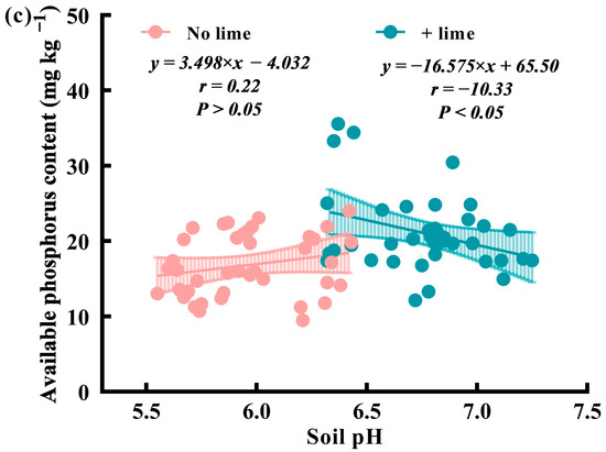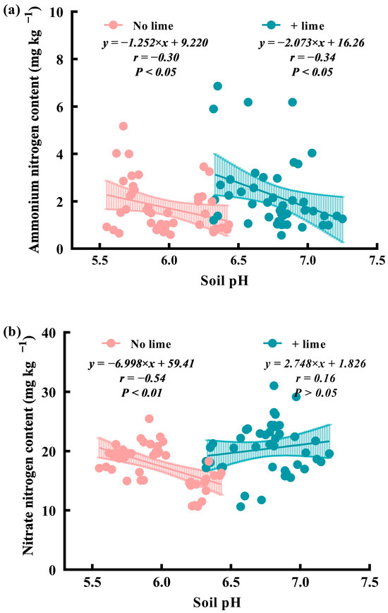 When lime was applied, the soil pH ranged from 6.33 to 7.17, and soil NH4+-N and AP levels were negatively related to soil pH (p < 0.05). Soil NO3−-N was positively related to soil pH, although the correlation was statistically insignificant (p > 0.05). Soil NH4+-N showed the highest correlation with soil pH, with a correlation coefficient of −0.34 (p < 0.05; n = 45). A weak correlation was observed between the soil pH and NO3−-N, with a correlation coefficient of 0.16 (p > 0.05; n = 45).