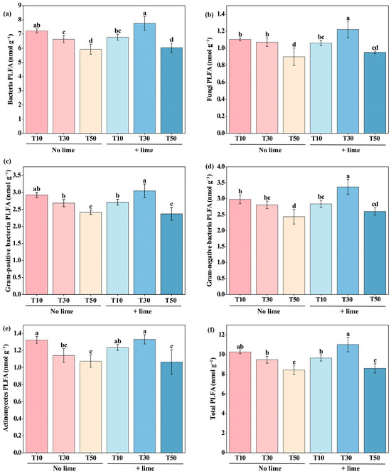 Soil bacteria PLFA (a), fungi PLFA (b), Gram-positive bacteria PLFA (c), Gram-negative bacteria PLFA (d), actinomycetes PLFA (e), and total PLFA (f) contents of the topsoil (0–20 cm) under different treatments at the end of the incubation period. T10, tillage depth 10 cm; T30, tillage depth 30 cm; T50, tillage depth 50 cm; T10+Lime, T10 plus lime; T30+Lime, T30 plus lime; T50+Lime, T50 plus lime. Different lowercase letters on the bars indicate significant difference among treatments (p < 0.05).