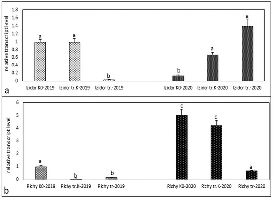 Transcript level of protein kinase in samples of “tr. K”, “tr.”, and “K0” from the progeny of 2019 and 2020 without abiotic stress. (a) cv. Izidor; (b) cv. Richy. Data represent the mean ± SE. Different letters denote statistically significant differences.