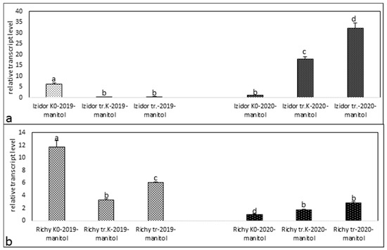 Treatment with stress agent mannitol in cv. Izidor (Figure 3a) for the seedling samples of the progeny of 2019 showed a tendency of decreased expression in the order “K0”—“tr. K”—“tr.” from 6.26 to 0.3. For the progeny of 2020, an activation of expression level was detected from 1, in “K0”, to 17.89 in “tr. K”, to 32.19 in “tr.”. In cv. Richy (Figure 3b), the expression profiles of the seedlings from progeny of 2019 treated with stress factor mannitol resembled those of cv. Izidor 2019. Detected expression level drops down from 11.67 in the “K0” samples to 3.3 in “tr. K” and again slowly rises to 6.04 in “tr.” samples. The tendency of expression levels in seedling samples from progeny of 2020 in cv. Richy was similar to that in cv. Izidor. The lowest expression was detected in “K0” at 1 and slowly rises to 1.76 in “tr. K” and to 2.8 in “tr.”.