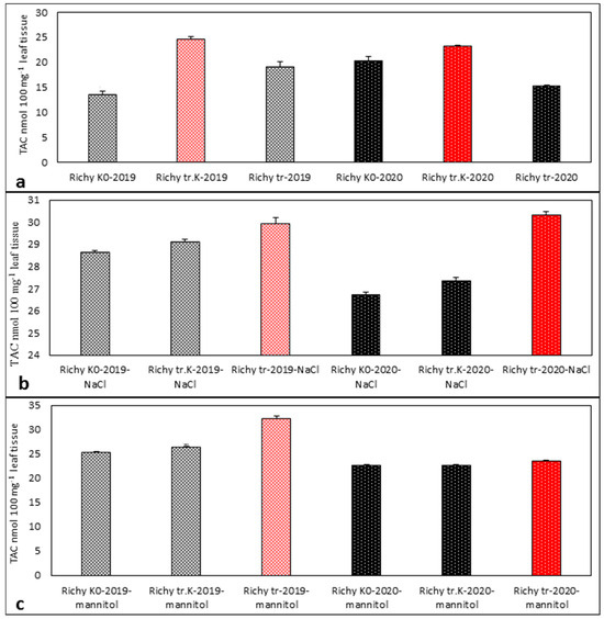Estimated TAC activity in samples of “tr. K”, “tr.”, and “K0” from the progeny of 2019 and 2020 of cv. Richy. (a) Without abiotic stress; (b) after salinity stress; (c) after drought stress. Data represent the mean ± SD.