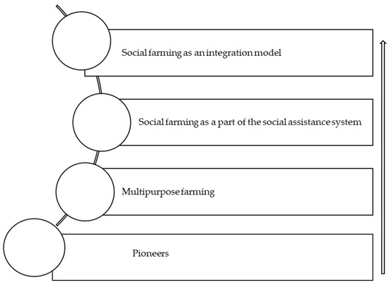 In the literature, it is very often pointed out that in Italy or France social farming is linked to the social and care sector; in the Netherlands to the health sector; and in Germany and Ireland it can be situated between the social and health sectors [28]. A good example of a country where social farming has an integrated role is the Netherlands. Thanks to the cooperation of several ministries (e.g., Ministry of Health and the Ministry of Agriculture, Nature and Food Quality) it is possible to co-operate, exchange experiences and adequately finance care activities. This benefits both the service providers and the guests themselves. This is important because contact with nature, with animals, is an important part of the respective therapy, depending on who the service recipient is [30]. Due to the development of social farming, it has developed in different phases taking into account specific needs and trying to respond to specific problems. In the initial phase, there were few farms, where it was not entirely clear how this care was to function and on what basis. However, as time went on and rural areas developed, it was noticed that these areas were an excellent place to combine agriculture and care by creating non-agricultural activities such as care farms.