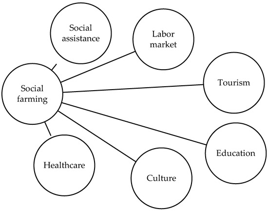 In turn, Di Iacovo and O’Connor [36] indicated in their study that social farming uses measures which rely on agricultural (i.e., vegetable and animal) resources to offer therapy, rehabilitation, social integration, education and social services. This is strictly related to “agricultural activities where (small) groups of people can stay and work together with family farmers and experience social practices” [36]. Hence, social farming spans agri-tourism farms, agricultural holdings and social gardens whose basic activity consists in integrating physically, mentally or emotionally disabled people as well as older adults, children and youth [37]. In turn, [1] has indicated that social farming includes measures that address current social and care needs.