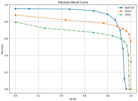 In essence, this graph highlights the tradeoffs between precision and recall for three different droplet tracking methods. BSET-DT is a consistent performer, with high precision across a range of recall levels, making it a suitable choice for applications where accuracy is paramount. Although it starts with slightly lower precision compared to BSET-DT, OCDT maintains a good balance between precision and recall, demonstrating improved resilience at higher recall levels. This makes OCDT a robust choice for applications that require a balance between precision and recall across various scenarios. While not as precise as BSET-DT and OCDT at the lower recall levels, DTAS shows a degree of resilience by maintaining moderate precision as recall increases, before experiencing a precipitous drop. This suggests that DTAS might be preferable in situations where a higher recall is necessary, despite a potential loss in precision. Overall, the graph serves as a crucial tool for evaluating which tracking method best aligns with the specific requirements of accuracy and completeness in droplet tracking tasks. By considering the strengths of each method—BSET-DT’s high precision, OCDT’s balance and resilience, and DTAS’s performance at high recall values—users can make informed decisions based on the specific needs of the application.
