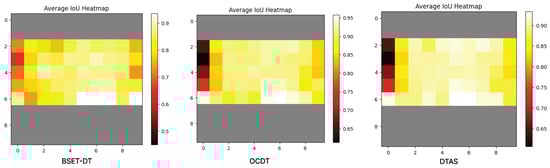 Visualization: The final heatmaps were visualized using a colormap; warmer colors (e.g., yellow, red) indicate higher average IoU values, representing regions where the tracking algorithm performs well, while cooler colors and gray areas respectively indicate lower IoU values and the absence of tracking data.