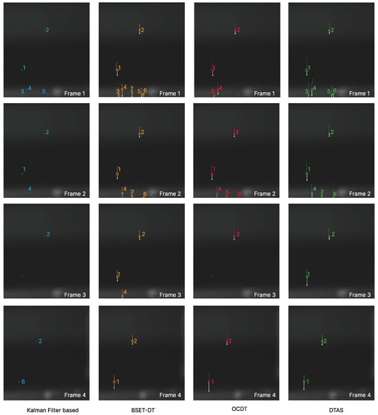 Figure 5 presents a comparative visualization of droplet tracking performance across four sequential frames using the three deep learning-based methods (BSET-DT, OCDT, DTAS) and the Kalman filter-based approach proposed in [