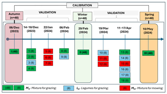 This study, carried out throughout the 2023/2024 pasture growing season, involved the collection of 288 pasture samples in two phases: calibration and validation (Figure 1).