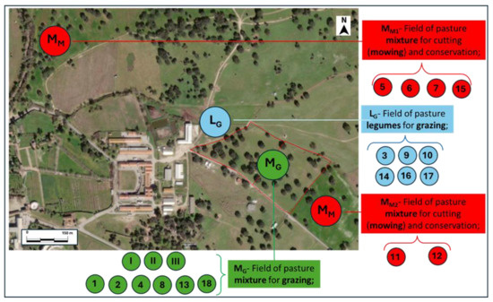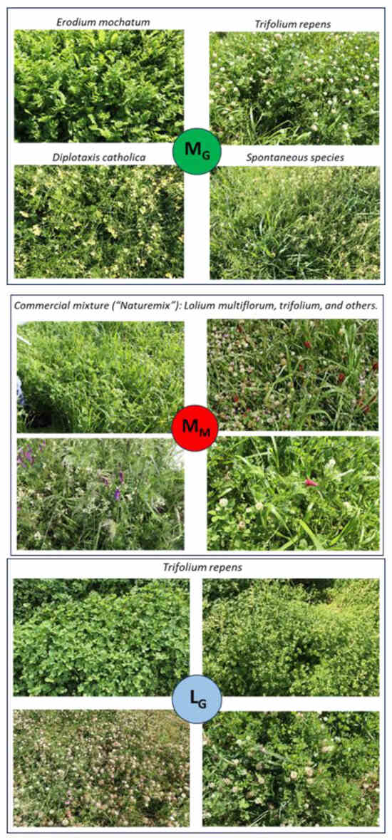 Figure 4 shows the predominant pasture species in each experimental field. The field “MG” is a pluriannual biodiverse pasture (mixture of species, legumes, grasses, and others, predominantly Erodium mochatum, Diplotaxis catholica, Trifolium repens, and spontaneous grasses) grazed by sheep. This field integrates a research project of the evaluation of the effect on a pasture of soil pH correction and different grazing systems. The field was subdivided into four plots: P1 and P2 were subjected to several applications of dolomitic limestone between 2016 and 2023; P1 and P4 were submitted to continuous grazing and P2 and P3 were submitted to deferred grazing. “MM” was sown with commercial mixtures of annual botanical species, not grazed (mowing and conservation), predominantly Lolium multiflorum and Trifolium spp. The field “LG” is an exclusively legume pasture (predominantly white clover—Trifolium repens), which is grazed annually by cattle.
