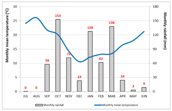 Considering the relationship between the productivity of dryland pastures and the variation in temperature and rainfall throughout the growing season, Figure 5 shows the thermo-pluviometric diagram (monthly mean temperature and rainfall) of the meteorologic station of Évora (about 10 km from the Mitra farm) between July 2023 and June 2024.