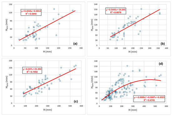 Relationship between pasture height (H) and pasture compressed height (HRPM) in calibration field tests: in December (a), in February (b), in May (c), and on all dates (d).