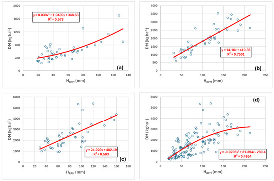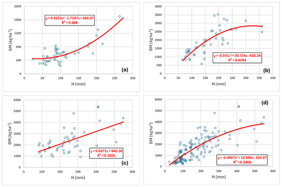 Relationship between pasture height (H) and dry matter (DM) in calibration field tests: in December (a), in February (b), in May (c), and on all dates (d).