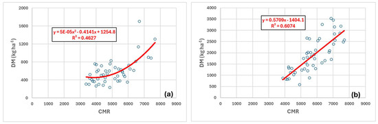The estimation of pasture productivity (DM) from height (H; Figure 9), compressed height (HRPM; Figure 10), or CMR (Figure 11) was also significant on all monitoring dates, with a tendency for R2 to drop sharply in the final phase of the growing season (spring).