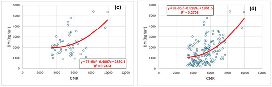 Relationship between corrected meter reading (CMR) and pasture dry matter (DM) in calibration field tests: in December (a), in February (b), in May (c), and on all dates (d).