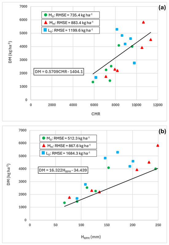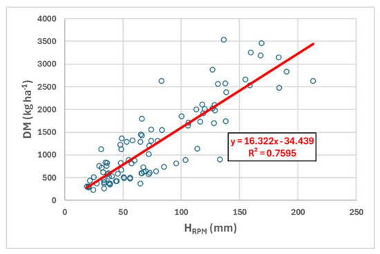 where DM is the dry matter yield (in kg ha−1) and HRPM is the compressed height (in cm) measured by the RPM.