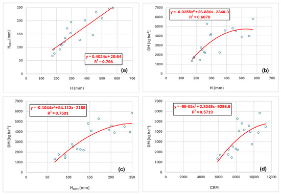 Validation field tests: (a) relationship between pasture height (H) and pasture compressed height (HRPM); relationship between pasture dry matter (DM) and height (H), and pasture compressed height (HRPM) and corrected meter reading (CMR), (b), (c), and (d), respectively.