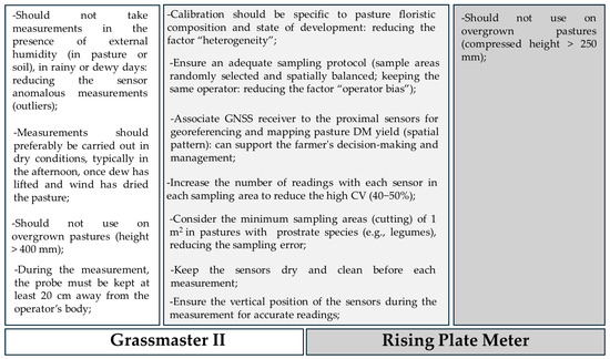 In addition to these recommendations, common to both sensors, there are also some indications specific to each of these sensors. For example, in the case of RPM, the operational principle restricts its use to very tall pastures (forage) with a compressed height of more than 250 mm, while in the case of Grassmaster II, its measurement sensitivity (electric field) does not exceed 400 mm in height. Additionally, in the case of Grassmaster II, the external humidity (in pasture or soil), typical of rainy, frosty, or dewy days, produces anomalous measurements (outliers) and requires the constant calibration of the sensor, which negatively affect the quality of the relationships between the variables under study [19].