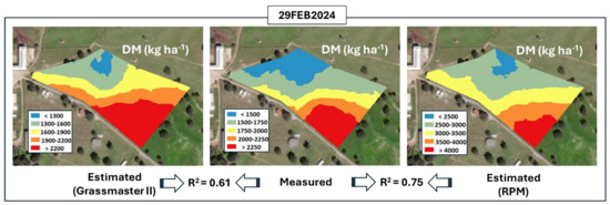 Maps of pasture productivity (DM) measured (obtained from reference laboratory determinations) and estimated, based on Grassmaster II probe and RPM readings in February 2024.