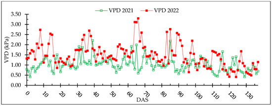 Papadakis’ agroclimatic classification system defines the climate in this area as subtropical Mediterranean with hot and dry summers [47]. Figure 1 shows the daily evolution of temperature (T) and relative humidity (RH) in 2021 and 2022, recorded by a datalogger (Onset HOBO and InTemp Data Loggers). In addition, from the recorded data, according to the methodology recommended by Allen et al. (1998) [48], the Vapor Pressure Deficit (VPD) for each day was obtained. The evolution of both years is shown in Figure 2, very high values of VPD (>2 kPa) were reached in 2022 at initial phenological stages. Table 1 shows the averages of temperatures, RH, and VPD in the comparison of both years. The comparison was performed for the entire crop season and for the days prior to field sampling (0–47 DAS, where DAS = Days After Sowing). The year 2022 was hotter and drier than 2021. According to Krishnan et al., (2011) [49], the ideal average daily temperature for crop growth ranges from 22 to 28 °C; maximum temperatures should not exceed 35 °C, while at night, temperatures higher than 22 °C could stress the plants due to a high respiration rate. Relative humidity values lower than 30% would also cause stress due to stomatal closure, and values higher than 90% could increase the incidence of fungal diseases. Thus, Figure 1 and Figure 2 show a higher number of optimal days with optimal temperatures and RH in 2021 compared to 2022.