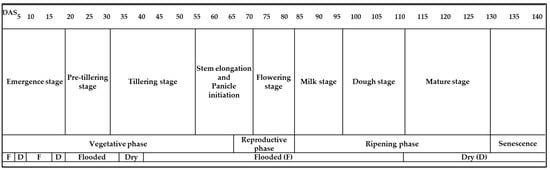 Timing of the main phenological stages of rice in Valencia until harvest (DAS: Days After Sowing). The last row represents water management. Adapted from San Bautista et al. (2022) [42].