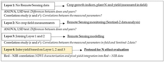 The proposal for monitoring rice crops as a predictive tool of anomalies in plant N nutrition includes four levels of analysis, distributed in layers as presented in Figure 4. In the first term, the crop growth indices, plant N, and yield (measured in the field) were considered. The effects of the main factors (N dose and year) were partitioned using ANOVA (Analysis of Variance). Mean separations were performed using the least significant difference (LSD) test at p < 0.05. Variations between parameters were fitted to the first-order equation using a least square fitted method. Similarly, the satellite data (reflectance and vegetative index) were analyzed in the second layer using ANOVA and LSD (second layer). In a third layer or analysis level, the correlations between the values of layer 1 and layer 2 were determined for all available dates; the values of each dose were combined, aiming in this study the joining of both layers in correlation models. Finally, the protocol for N effect evaluation was built using a fourth analysis level or layer, and in this case, the NDVI was characterized. Red–NIR correlation, based on San Bautista et al. (2022) [42] is a useful tool for crop monitoring. The novelty in this new proposal is the incorporation of combined yield registered in the red–NIR dynamics, considering also three key moments in crop nutrition (tillering, stem elongation and ripening). The proposed procedure aims to establish a relationship between red–NIR and NIR–NDVI, using Sentinel pixel for each estimated yield and nitrogen dose in different N content and years before stem elongation and panicle initiation [40]. This approach will allow us to detect anomalies in plant growth and suggest adjustments to crop management practices related to plant nutrition for rice plants.