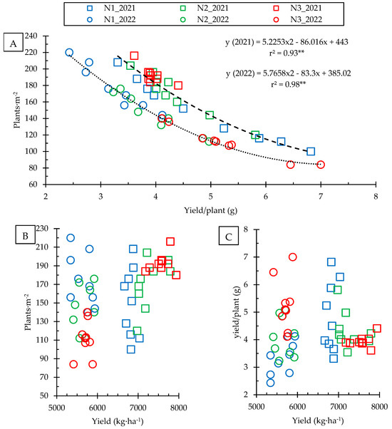 Of the aforementioned results, a special mention should be addressed to the values of plants per m2 and yield per plant. In the year 2021, the highest number of plants was found in N3; however, for the year 2022, it was the opposite, finding in N3 the lowest number of plants. This phenomenon, attributed to uncontrolled field variables, provoked significant changes in yield values per plant. Thus, while in 2021, the differences in yield per plant between treatments were not significant, the differences were significant in 2022, when the higher N dose resulted in a higher yield per plant. In the comparison between years, the differences are statistically significant in the N1 and N3 doses (p < 0.05), and the N1 dose in 2021 showed a higher yield per plant (probably due to the lower number of plants) than the same dose in 2022. On the other hand, the N3 dose showed a higher yield per plant in 2022 (probably also due to a lower number of plants). No significant differences between years were found at the N2 dose. The interaction between the number of plants and yield per plant is evident in Figure 5A. A quadratic adjustment between both is shown for each studied year. In 2022, despite the lower number of plants, the yield per plant did not increase. The N2 and N3 doses showed a yield per plant similar to the maximum in 2021. According to Figure 5B, which shows the yield in terms of plants per m2, and Table 3, a higher dose of N increased the yield in the points with a high number of plants in 2021; but this result cannot be contrasted in 2022, where the number of plants in N2 and N3 was lower. Figure 5C demonstrated that yield per plant was no higher than 7 g plant−1. The result obtained in 2022 is remarkable—a higher yield per plant was insufficient to increase the yield of the N3 dose with respect to N1. In summary, the lower number of plants in the year 2022 resulted in an increase in yield per plant in N3, but this was not enough to improve yield.