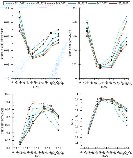 In the NIR band, it was also difficult to find a clear pattern at 20 DAS. After this date, in this band, different results were obtained each year. In 2021, reflectance increased with N dose from 45 DAS, and the differences between N1 and the other rates increased at grain filling (similar to visible bands). In 2022, the lowest N dose exhibited the highest reflectance during the vegetative phase, but no differences were observed between N2 and N3. The differences between N1 and N3 disappeared during grain filling and ripening, thus, the NIR season reflectance was similar in the three doses. In the comparison between years, remarkable differences were also observed. In this way, reflectance in the NIR was higher in 2021 during the vegetative phase (mainly 45 and 55 DAS). This difference was reduced during grain filling and ripening when reflectance remained higher only in the 2021 N3 dose. The reflectance in the 2021 N1 and N2 doses dropped below the 2022 values in the last phases of the season (85, 105, and 125 DAS), and more importantly, the decrease in the low dose (N1).
