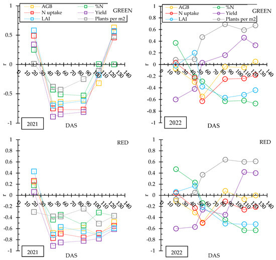 The correlation study between the green, red, and NIR spectral bands and each of the measured parameters is shown in Figure 7 for both years. In this analysis, the results revealed clear differences between years. In 2021, most of the parameters showed an optimal correlation with satellite data, especially at the date close to the sampling (45 DAS). The visible bands were negatively correlated on all dates, with the exception of the first date for green and red and the last one for Green. In the NIR band, significant correlations were positive on all dates. Plants per m2 and N concentration were the variables that exhibited the lowest correlation in that year, while yield showed the highest correlation in all bands. The results in 2021 were consistent with the findings of the previous sections. Thus, a lower reflectance value in the green and red bands was correlated with a high yield value, N uptake, biomass, and LAI, whereas the correlation for plants per m2 and N concentration was lower. In the NIR band, a higher value was correlated with an increase in the measured parameter values. On the other hand, in 2022, the correlations were low and highly variable. During the vegetative phase, the correlations were low; only biomass and N uptake showed a similar correlation to 2021 in the visible bands, but this trend disappeared in the grain filling and ripening stages. In these bands, the negative correlation for N concentration and LAI took significant values at distant dates from sampling; similarly, in the NIR, the %N was negatively correlated with reflectance after the sampling date. The number of plants in 2022 did not show any correlation in the vegetative phase, but during the grain-filling and ripening stages, positive correlations were found in the green and red bands (a higher number of plants resulted in a higher reflectance in the visible bands). There was no correlation in the NIR band. The correlation with yield and bands in 2022 followed a similar behaviour in the three bands; on the first date (20 DAS), the correlations were negative. However, these correlations disappeared in the middle dates of the season and turned positive at ripening, being significant in the NIR band.