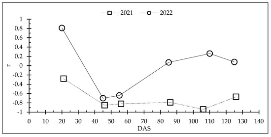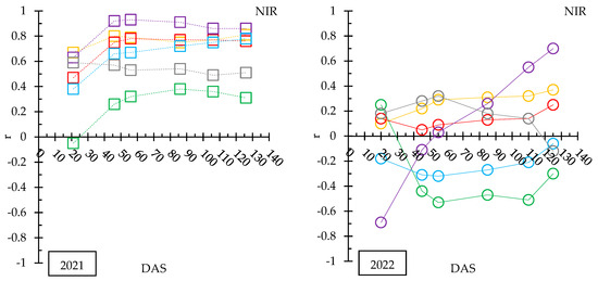 Time evolution of the correlation coefficient (r) between the red and NIR bands in both years (2021 and 2022). Correlations are statistically significant at p < 0.05 for r ≥ |0.64|.