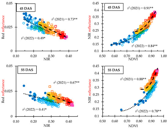 Red–NIR dynamics and lineal model (left) and NIR–NDVI and quadratic model (right) dynamics as a function of yield range in kg·ha−1, Days After Sowing (45, 55 and 85 DAS) and year (□: 2021; and ○: 2022). **, * and ns: significant at p < 0.01, at p < 0.05 and non-significant.