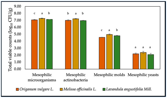 Despite the cold weather conditions during sampling, the soil samples in our study demonstrated a high microbial abundance. The highest levels of culturable mesophilic microorganisms, fungi, and actinobacteria were found in the soil from the lemon balm rhizosphere (Figure 1). All samples showed a high concentration of culturable actinobacteria, ranging from 6.97 to 7.23 log10 CFU/g. However, microbial analysis revealed that these microorganisms were present in significantly lower numbers (p < 0.05) in the soil samples collected from the lavender and oregano crops. In contrast, no significant differences (p > 0.05) were observed in the counts of culturable mesophilic yeasts across the three plant species.