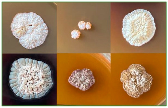 The morphological and cultural characteristics of the isolates were assessed following the International Streptomyces Project (ISP) guidelines, using ISP-2, ISP-3, ISP-4, ISP-5, ISP-6, and ISP-7 media [30]. The colony characteristics were examined under a high-powered magnifying glass and noted after 14 days of incubation [31,32]. The selected strains exhibited typical actinobacterial phenotypic morphologies [33].