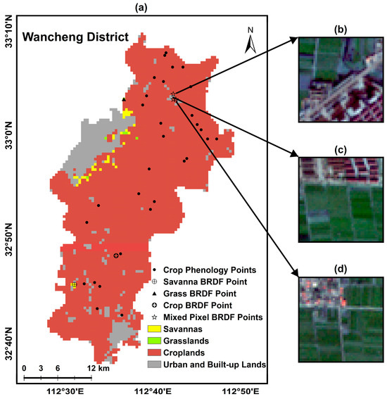 Figure 1. Spatial extent of the Wancheng District study area (in Henan Province, China). (a) Map of land cover types showing the location of sampling points across the study area. This map came from MCD12Q1 (v061). (bd) True-color images of the three mixed pixels, obtained from Sentinel-2. The distribution characteristics are as follows: crops above with buildings below (b); crops below with buildings above (c); and buildings in the upper-left corner, crops in the remainder (d).