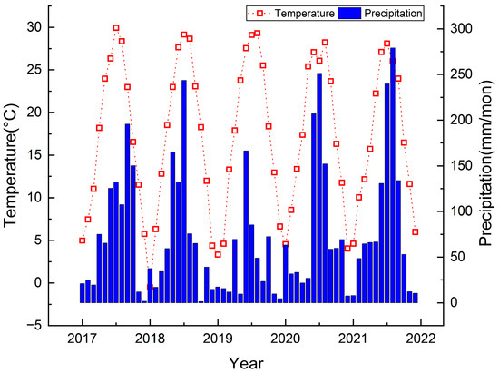 Figure 2. Monthly average temperature and monthly total precipitation in the study area, from 2017 to 2021.