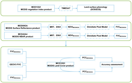 Figure 3. Data processing flow chart. The green rectangles from top to the bottom represent three steps: crop phenological parameters extraction with TIMESAT; Fractional Vegetation Cover (FVC) derived from MOD09GA and MCD43A4; and accuracy evaluation, respectively. Blue solid rectangles refer to a used product or derived results, while blue dashed rectangles refer to the software or model used in this study. NDVIMOD09GA: NDVI derived from MOD09GA, NDVIMCD43A4: NDVI derived from MCD43A4, FVCMOD09GA: FVC derived from MOD09GA, FVCMCD43A4: FVC derived from MCD43A4. PCCMOD09GA: Pearson correlation coefficient (PCC) calculated for FVCMOD09GA and GEOV3 FVC, PCCMCD43A4: PCC calculated for FVCMCD43A4 and GEOV3 FVC.