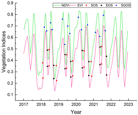 Figure 4. NDVI and EVI time series fitted curves and phenological parameters of crops. SOS: start of season; EOS: end of season; SGOS: stable growth of season.