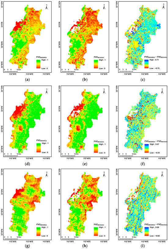 Figure 5. Spatial distribution of Fractional Vegetation Cover (FVC) derived from MOD09GA and MCD43A4, and the difference images of FVC. FVCMOD09GA: FVC derived from MOD09GA, FVCMCD43A4: FVC derived from MCD43A4. (ac) FVC derived from MOD09GA, MCD43A4, and the difference between FVCMOD09GA and FVCMCD43A4 on 15 November 2020, respectively; (df) FVC derived from MOD09GA, MCD43A4, and the difference between FVCMOD09GA and FVCMCD43A4 on 10 February 2021, respectively; (gi) FVC derived from MOD09GA, MCD43A4, and the difference between FVCMOD09GA and FVCMCD43A4 on 30 September 2021, respectively.