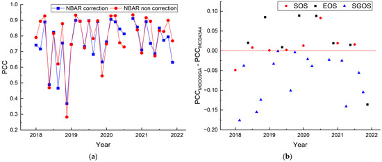 Figure 6. Pearson correlation coefficients (PCCs) of Fractional Vegetation Cover (FVC) derived before and after the NBAR correction with GEOV3 FVC at different stages of the growing seasons. FVCMOD09GA: FVC derived from MOD09GA. FVCMCD43A4: FVC derived from MCD43A4. PCCMOD09GA: PCC calculated for FVCMOD09GA and GEOV3 FVC, PCCMCD43A4: PCC calculated for FVCMCD43A4 and GEOV3 FVC. (a) PCCMOD09GA and PCCMCD43A4 in 2018–2021; (b) Scatterplot of numerical differences between PCCMOD09GA and PCCMCD43A4. SOS: start of season; EOS: end of season; SGOS: stable growth of season.