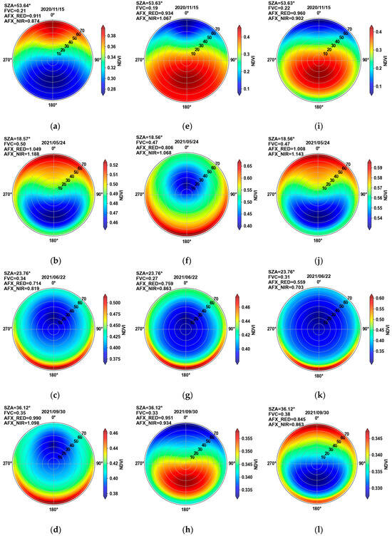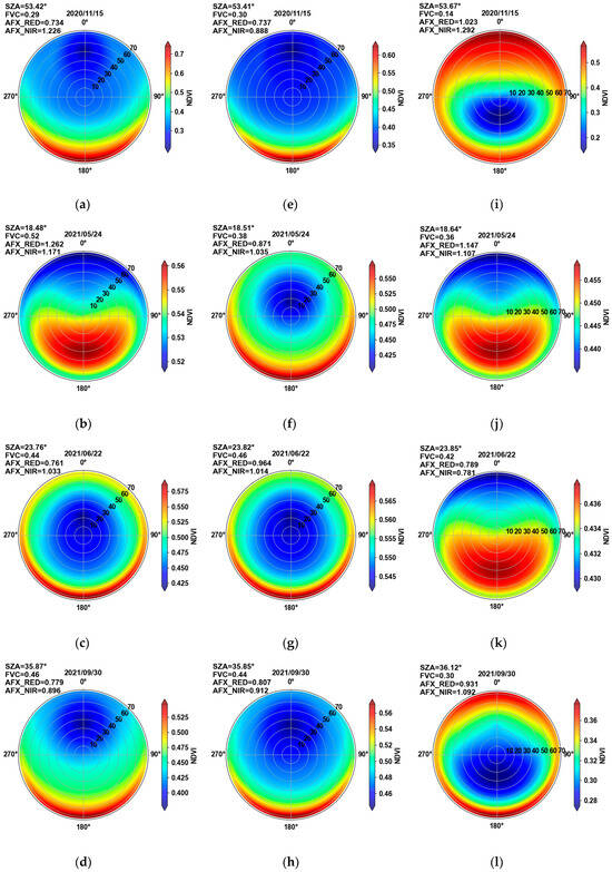 To explore the influence of the distribution characteristics of the mixed pixels on the BRDF patterns in the different stages of the growing seasons, this study obtained the MCD43A1 product of the three mixed pixels with different stages of the growing seasons in Figure 1a, to create NDVI polarization maps. The distribution characteristics of the three mixed pixels are shown in Figure 1b–d. The results are shown in Figure 8. The format for drawing the NDVI polarization map is the same as that in Section 4.2.