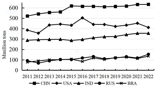 Food production in the world’s top five food-producing countries, 2011–2022 (data are from the World Bank. In this figure, CHN, USA, IND, RUS, and BRA denote China, the United States, India, the Russian Federation, and Brazil, respectively.).