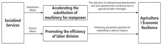 Theoretically, socialized services not only help accelerate the substitution of machinery for manpower and alleviate the issues of land abandonment and semi-abandonment caused by labor shortages, but they also improve the specialized capacity to cope with agricultural risks through the efficiency of labor division. This, in turn, enhances the resilience and adaptability of the agricultural economy to adverse shocks, thereby contributing to the enhancement of AER. Therefore, this paper primarily elucidates the internal mechanisms through which socialized services influence AER, focusing on the substitution effect and the division of labor effect (Figure 2).
