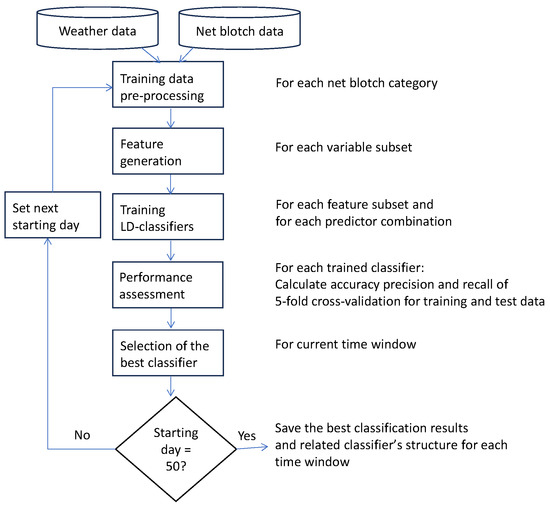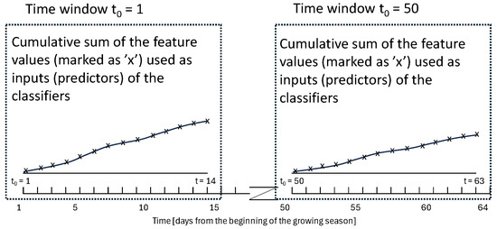 Classification with an ensemble consisting of three linear discriminant (LD) binary classifiers and with one LD multiclass classifier was analyzed in this study. Firstly, the data sets of the net blotch and weather measurements were pre-processed and generated into the features as presented in detail in [18,19]. Then, the cumulative sums of the feature values were computed in a 14-day sliding data window and applied to the classifiers as predictors (inputs). This was repeated in 50 consecutive time windows, with the first data window starting day being the beginning of the growing season as shown in Figure 1. The 14-day time window was chosen based on earlier research [20] as it consistently offers enough information to robustly classify different net blotch severities.
