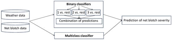 In this study, over 26 years of historical net blotch data and weather measurements are combined, pre-processed and applied to selected classifiers as predictors (model inputs). Linear discriminant analysis (LDA) is utilized here as a model structure for the classifiers. LDA has been used earlier in agricultural classification cases, for example, in grain quality traits in rice [21], a potato diversity study [22] and authentication of food products [23]. Here, the input variables for classifiers were selected based on earlier studies by the authors [17,18,19,20]. The most suitable feature and the most accurate classification method for three different net blotch severity levels were identified. It was assumed that the most suitable weather variables identified earlier could be adopted because the phenomenon (barley net blotch) was the same; however, the most suitable feature may now differ because the research frame was extended from a two-level classification to a three-level classification. The main hypothesis was that feasible classification results for net blotch severity can be achieved by applying linear discrimination analysis. This hypothesis was tested by building an ensemble of three binary classifiers and one multiclass classifier. As a potential outcome, when the estimation of net blotch severity can be made early in the growing season, it will ensure the need and time for planning plant protection measures.