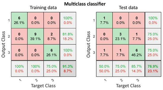The confusion matrix for the multiclass classifier indicates that 21 correct classifications out of a total of 23 instances in the training data were achieved. The matrix reveals two misclassifications where the predicted category was 2, whereas the correct category should have been 3. In the test data, the multiclass classifier achieved 10 correct classifications out of a total of 13. Three misclassifications occurred, with one instance where the predicted class was 2 instead of 3, and two instances where the predicted classes should have been categories 1 and 2, respectively. The overall accuracy of the multiclass classifier was 91.3% on the training data and 76.9% on the test data. The precision and recall for categories 1, 2 and 3 were as follows: