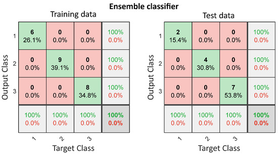The confusion matrix for the ensemble classifier (Figure 4) shows 100% overall accuracy in both training and test data, indicating perfect classification with the available data. During the sliding window starting on day 13, both ensemble classifiers achieved 100% precision and recall in both training and test data.