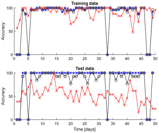 The overall accuracy of the best-performing classifiers for the whole analyzed time period is presented in Figure 6. The multiclass classifier is denoted by ‘x’ and a red line, while the ensemble classifiers using the arithmetic mean and geometric mean for the aggregation of binary classifications are represented by ‘o’ with a black line and ‘*’ with a blue line, respectively.
