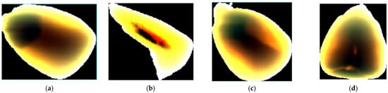 The 2496 kernels were divided into four categories that included intact (IN; 600 kernels), broken (BR; 552 kernels), internally cracked (IC; 720 kernels), and surface cracked (SC; 624 kernels). All seed images were divided according to the ratio of training:validation:test sets = 4:1:1 and a hyperspectral mechanical damage dataset for corn seeds was constructed. The composition of the dataset is shown in Table 1. Hyperspectral true color images of seeds of various categories are shown in Figure 1.