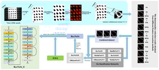 As presented in Figure 2, hyperspectral images are first preprocessed after acquisition. Then, a binary mask was obtained based on the 1000.5995 nm gray scale image. Based on the mask, it is cropped to one image per seed. These seed images were divided into datasets by species and scale. Feature extraction is performed separately for each seed picture, followed by Sobel edge detection and Laplace edge detection. The image after edge detection is linearly stretched and then resized to 224 × 224 and then saved as a jpg. Each feature extraction method receives its respective corresponding jpg dataset. The corresponding jpg images obtained by different feature extraction methods are input into the six classification models. The classification results of the six models are synthesized and the three jpg datasets with the best results are filtered to form a combined dataset. The combined dataset is put into the six models and the ResNeSt model is selected by considering other metrics. The improved ResNeSt_E model is proposed on the basis of ResNeSt.