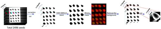To facilitate the analysis, a preprocessed hyperspectral image was processed. An image with a wavelength of 1000.5995 nm was selected. The sample exhibited a relatively clear outline in the band image. A grayscale histogram is used to separate the sample from the image, obtain an outline of each seed, and generate a binary mask. A hyperspectral image with the background removed was obtained by multiplying the binary mask by the image of all bands. The image was then cut using a binary mask to obtain the hyperspectral image of each seed. The flowchart is presented in Figure 3.