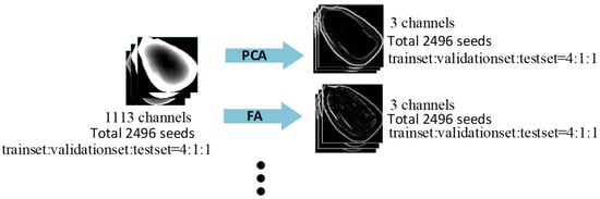 We randomly selected hyperspectral images of some seeds and downscaled them using PCA, FA, and KPCA, and the explained variance of each component calculated. Table 2 presented the results for one of the seeds. It can be seen that the cumulative explained variance of the first three components exceeds 99% in all three methods. Therefore, we set the final number of components to three.